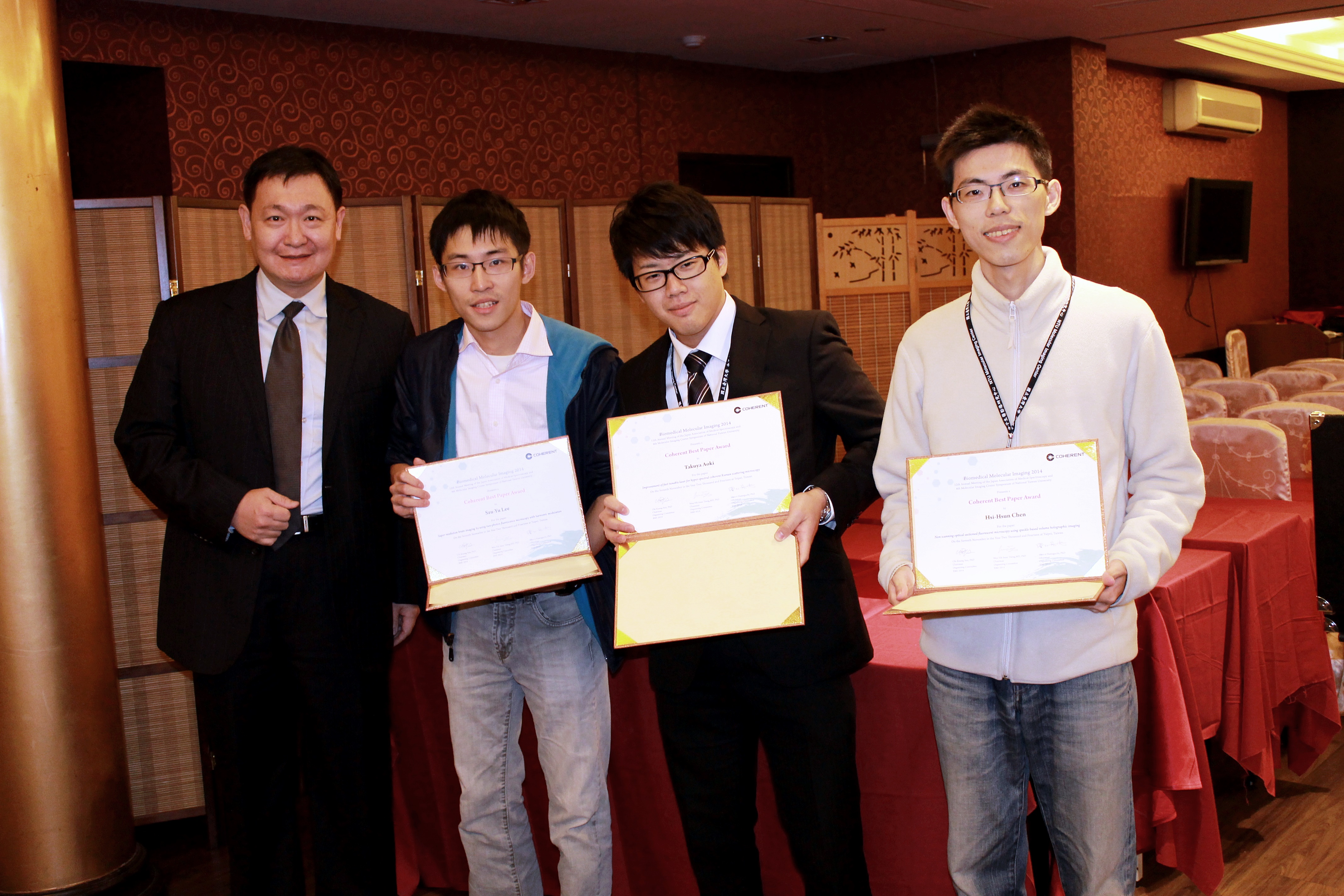 20 November 2014 Congratulation !!! Hsi-Hsun Chen received Coherent Best Paper Award in Biomedical Molecular Imaging Conference 2014 Prev Next
